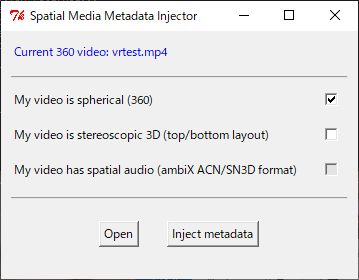 - Spatial Media Metadata Injectormp4動画に360°動画だとのメタタグを埋め込んでくれます