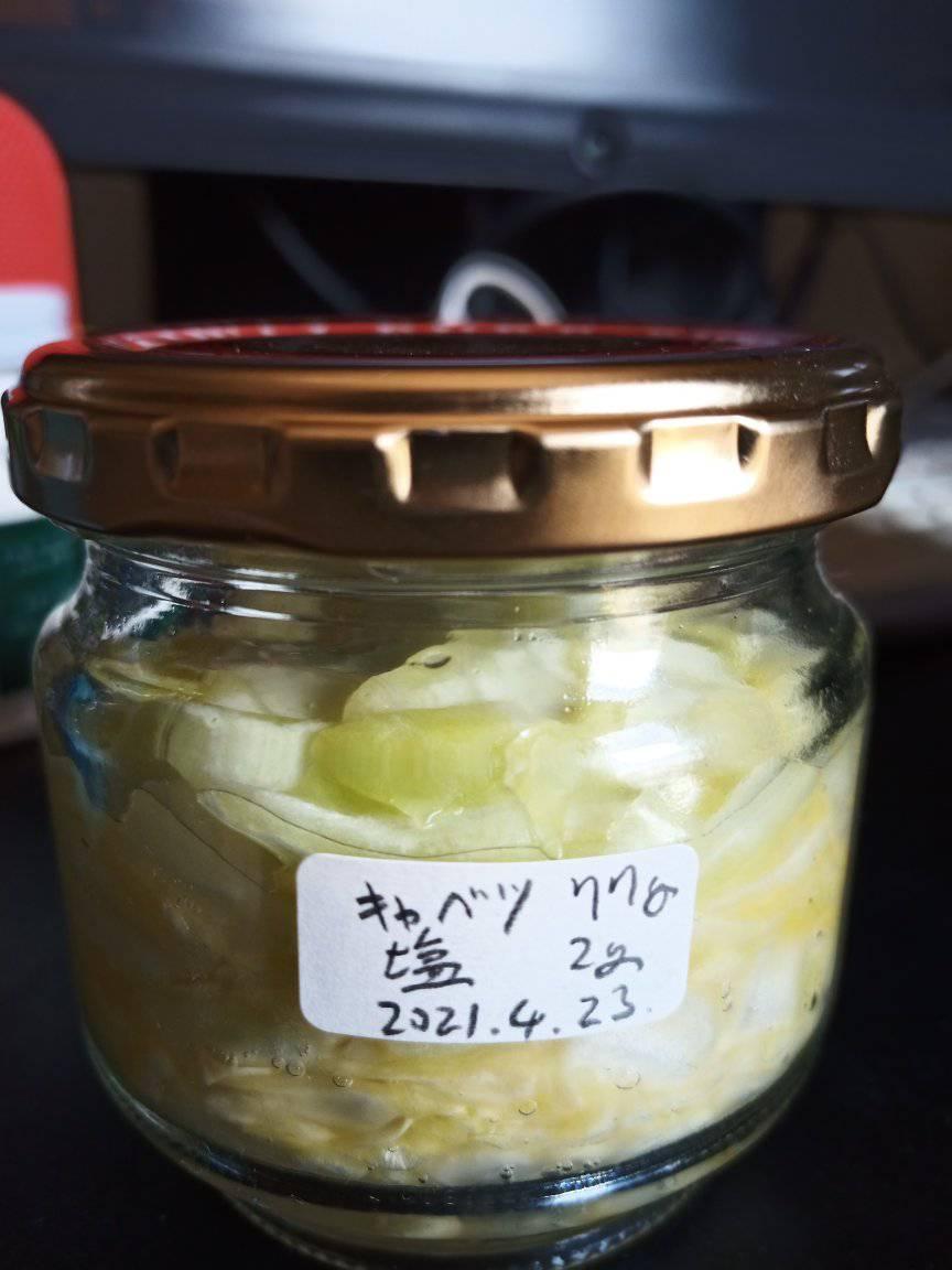 キャベツから出た水気も瓶に詰めて、キャベツが水に沈んで空気に触れていなければ蓋を閉じる。一番上をキャベツの外葉やラップで押さえて空気を遮断する流儀などもあるようです。重しやつっかえ棒で押さえたり、ですね
