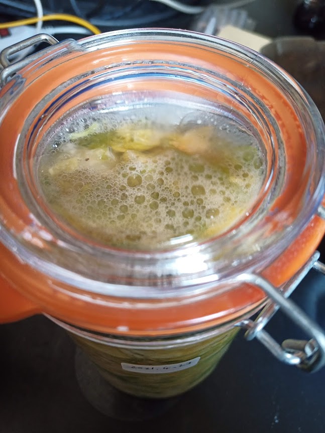 発酵が始まった様子。押し込むと泡立つ。乳酸発酵しているらしい、漬物の匂いもある。