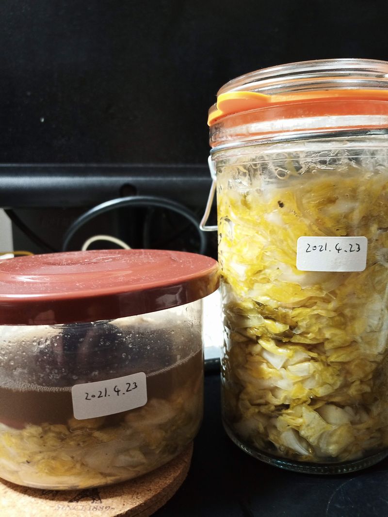 キャベツから出た水気も瓶に詰めて、キャベツが水に沈んで空気に触れていなければ蓋を閉じる。一番上をキャベツの外葉やラップで押さえて空気を遮断する流儀などもあるようです。重しやつっかえ棒で押さえたり、ですね